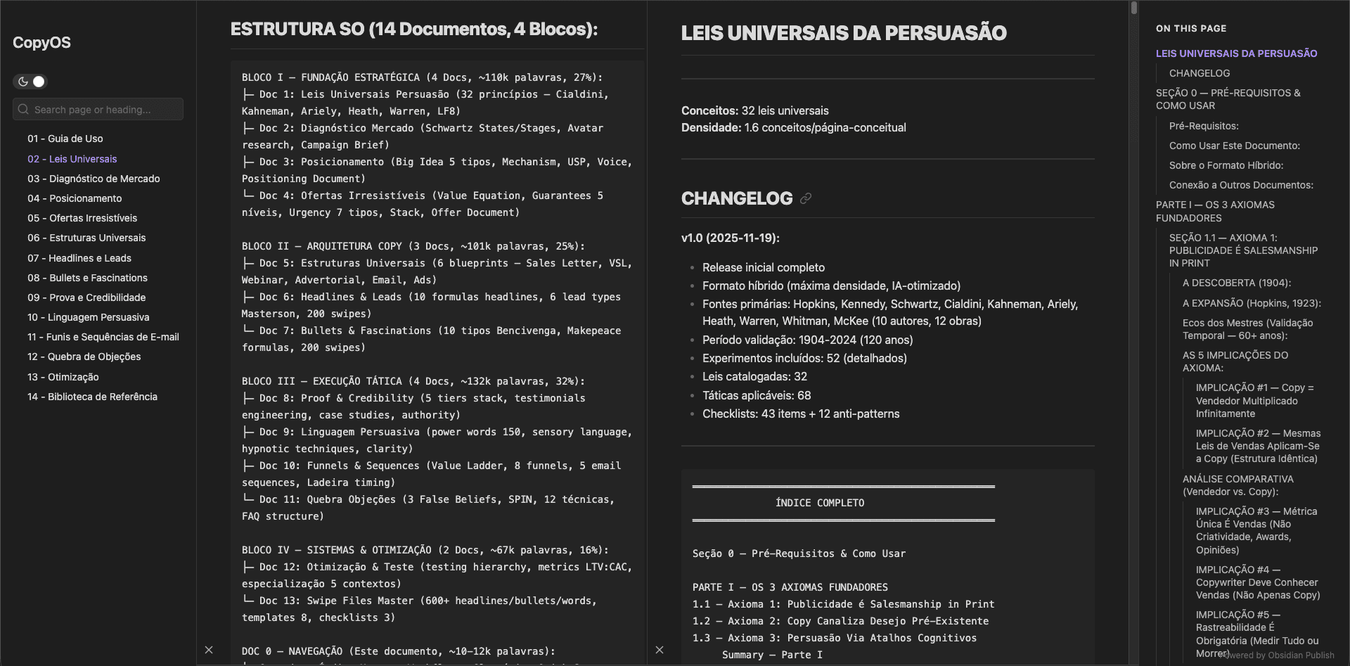 O essencial de +100 anos de copywriting, princípios, autores e técnicas, organizados em um ambiente organizado, navegável e fácil de aplicar.